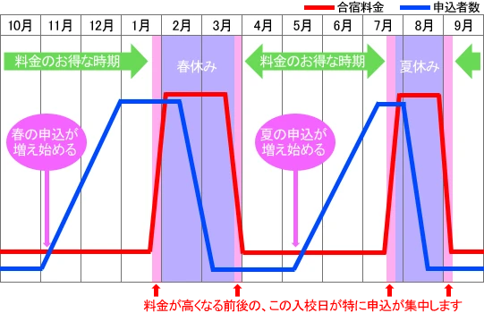 合宿免許では入校する時期によって料金が大きく異なります。1年の中では春休みと夏休みの時期が最も教習所が混雑する繁忙期となり、合宿料金も高くなります。料金が高くなる直前の入校日や、料金が下がった直後の入校日はとても人気が高く、毎年早い段階で予約が埋まります。ご希望の入校日に確実に申し込むためには、入校日の2~3ヶ月前を目安に、早めのご予約が必要となります。
